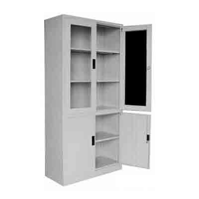 Lemari Arsip Besi Ketebalan Plat 0,7 warna Grey Pintu Ayun kaca bagian atas dan besi bagian bawah ukuran 1800 x