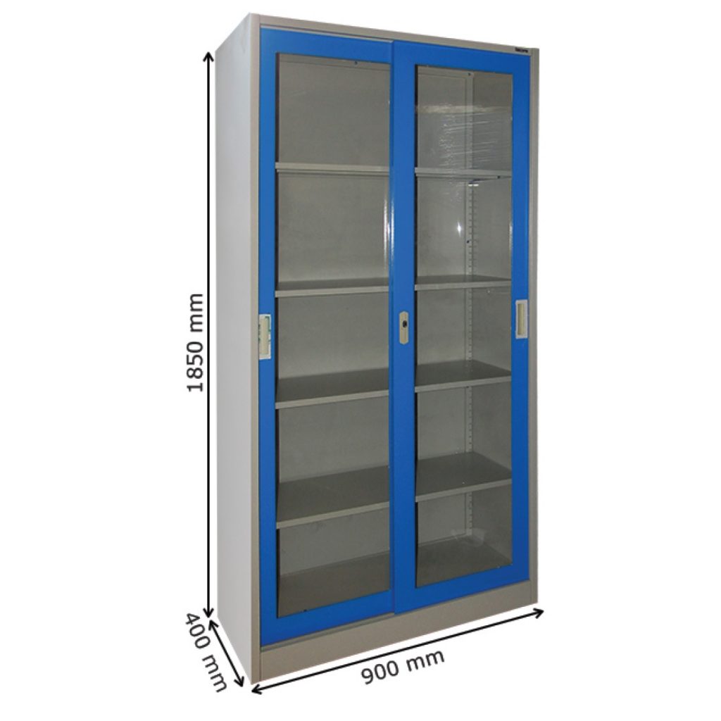 Lemari Arsip Besi SC E18 BT Spesifikasi : Pintu Sliding Kaca Ukuran W900x D400 x H1850 mm Ketebalan Plat 0.6