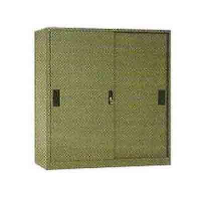 Lemari dengan bukaan digeser dan juga memiliki daun pintu yang terbuat dari plat
