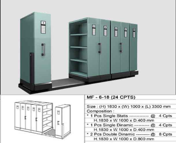 Mobile File System Manual Alba MF-6-18 (24 CPTS) Ukuran: H.1830 x W.1000 x L.3300 mm Composition : 1 Pcs Singe Statis