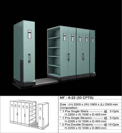 Mobile File System Manual Alba MF-6-22 (30 CPTS) Ukuran: H.2200 x W.1000 x L.3300 mm Composition : 1 Pcs Singe Statis
